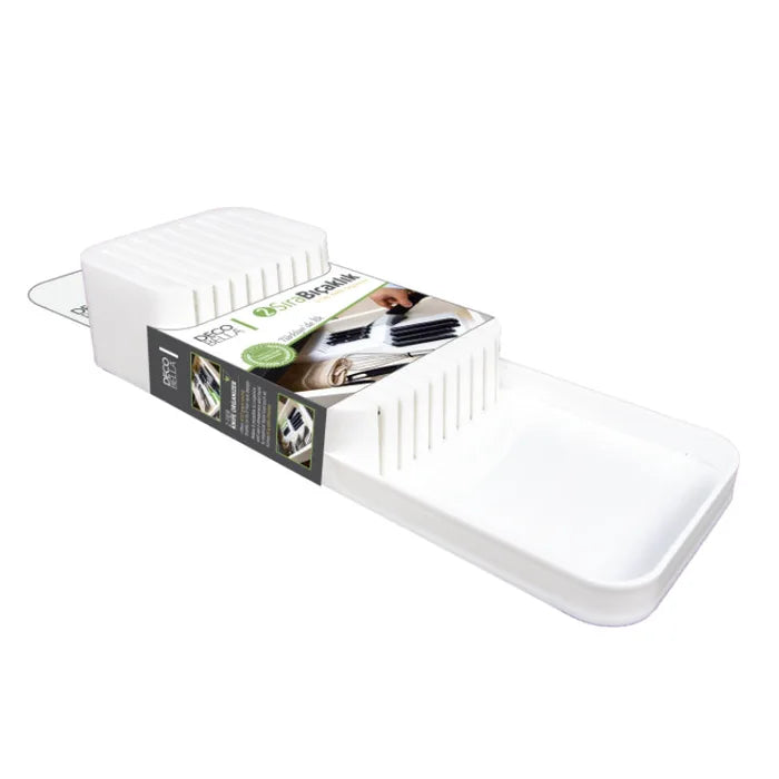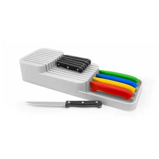 Produsul este realizat din plastic, are forma dreptunghiulara si este compartimentat, pentru o buna organizare si depozitare a cutitelor.