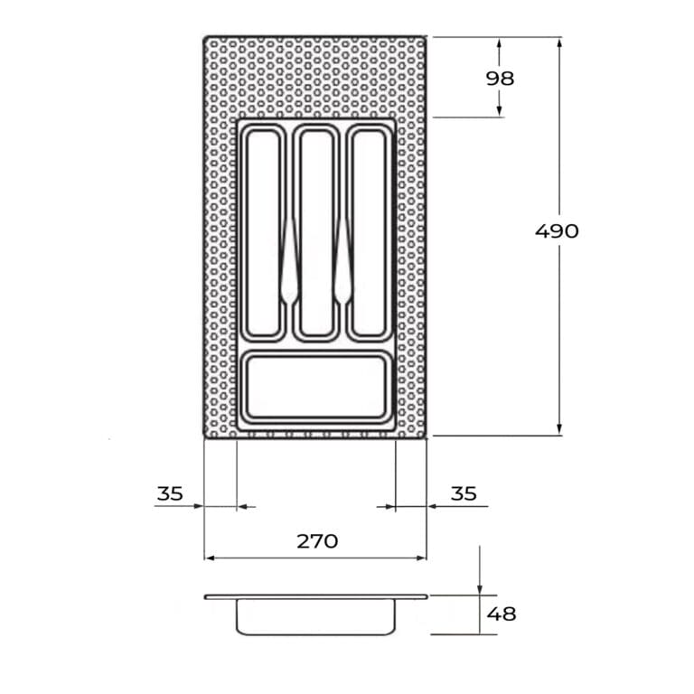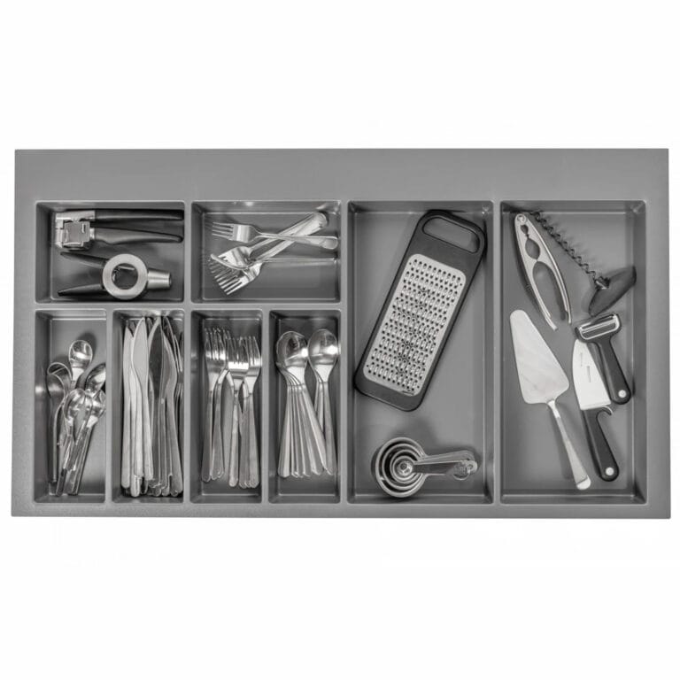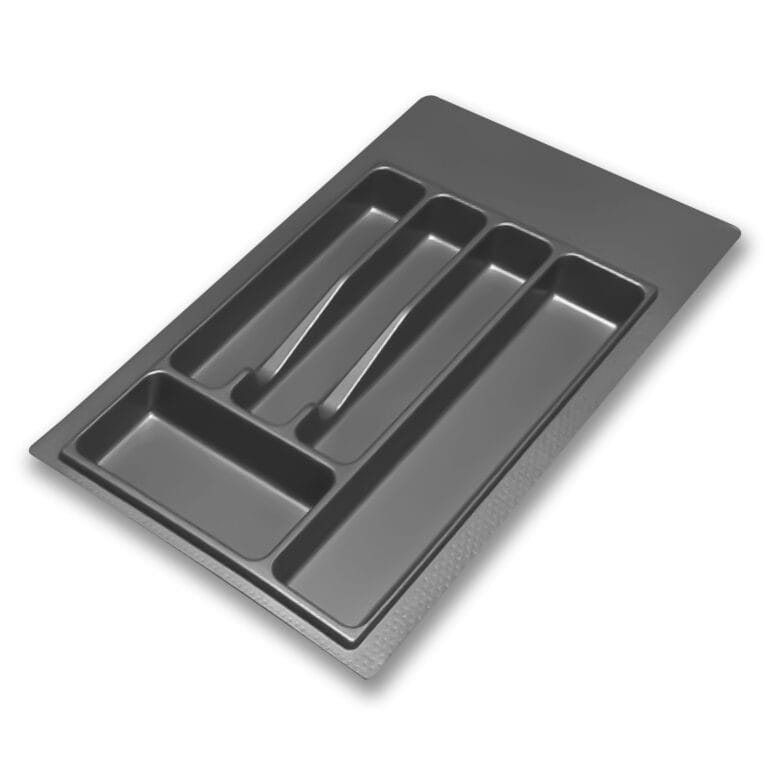 Suportul pentru tacâmuri sau organizatorul de sertar este din plastic de calitate și este proiectat pentru a fi ajustabil prin decuparea părții din spate, dreapta sau stânga, conform nevoilor utilizatorului. Fiind cu spații dedicate pentru diferite tipuri de tacâmuri și ustensile de bucătărie. Este ideal pentru a menține ordinea și eficiența în sertarele mobilierului de bucătărie.